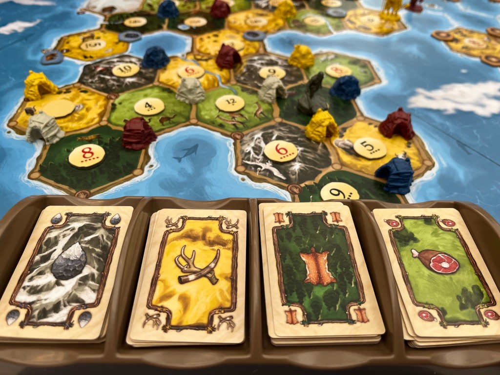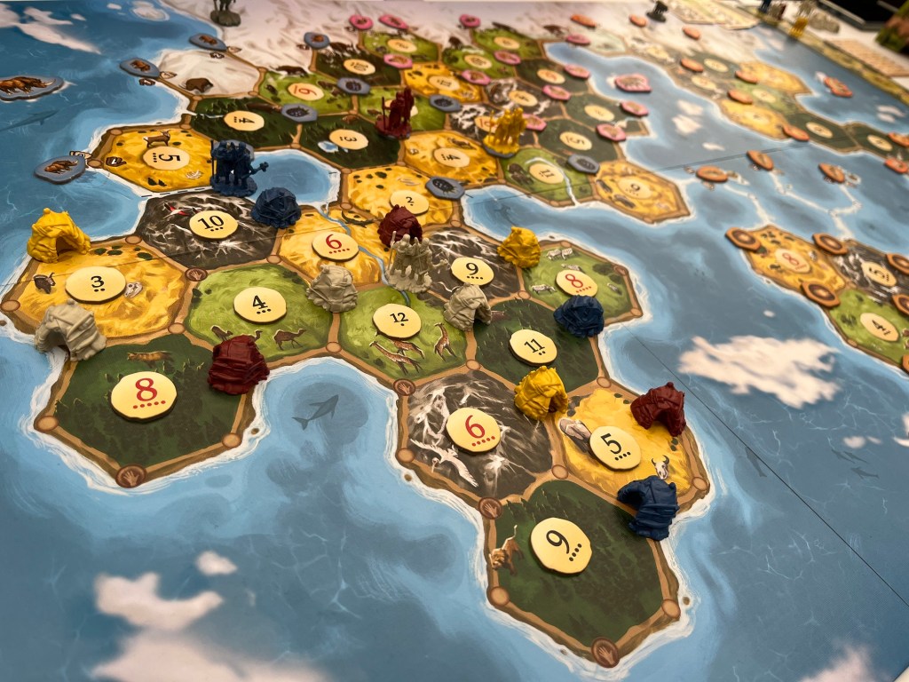 Catan: Dawn of Humankind is rooted in Catan and thus most actions can easily be understood by comparing to an equivalent in the original game. One of the more thematic mechanics in the game was the depleting of resources in Africa later in the game. Like early nomadic tribes, you might need to move your camp to a new region to survive. As with Catan, the first player to earn 10 victory points wins the game.