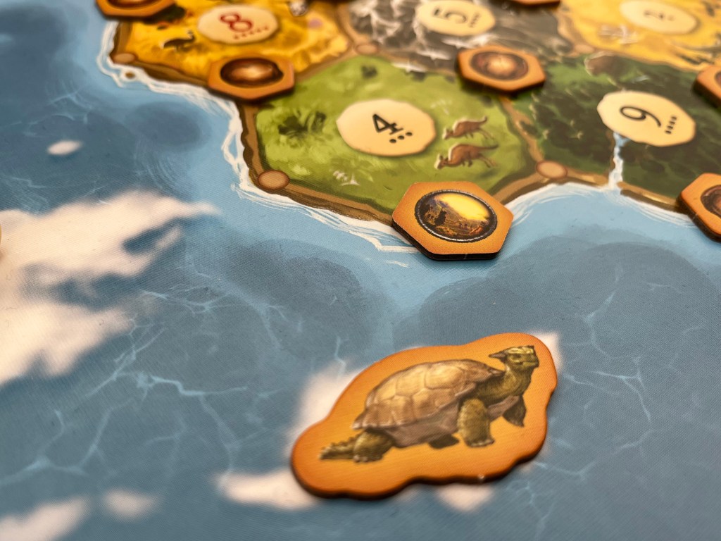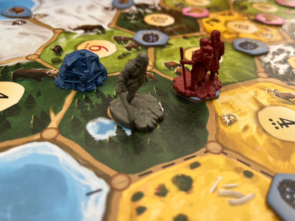When a 7 is rolled, the player can move either of the tribal threats. The Neanderthal is limited to Africa and America, and the smilodon will move around Asia and Australia. These are the robbers in Catan: Dawn of Humankind, so now players have to contend with two robbers.