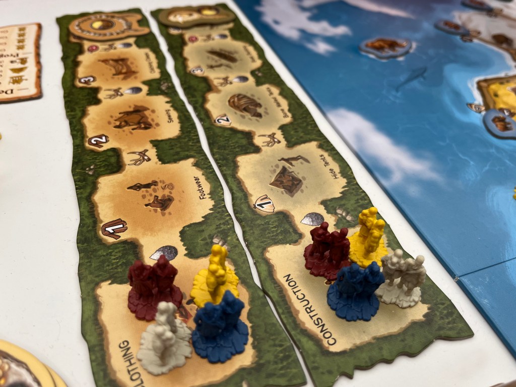 Players can spend resources to progress on tracks in clothing, construction, hunting, and food. Food allows players to increase their move action from 3 spaces to 7. Hunting will allows players to move either of the tribal threats without rolling a 7. The first to completely progress a track will earn a token worth 1 victory point.