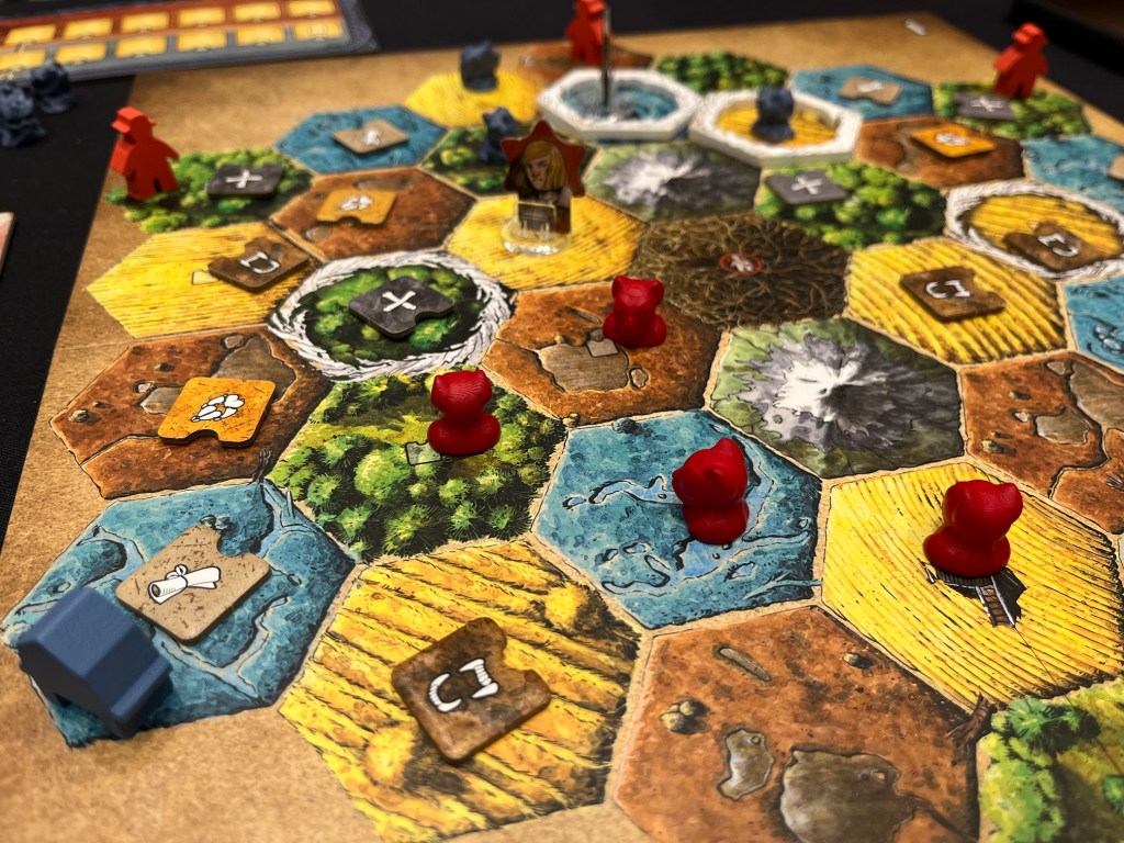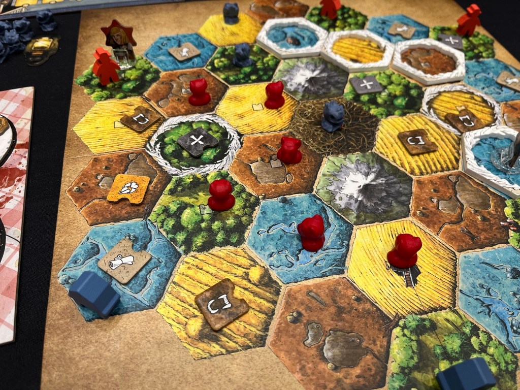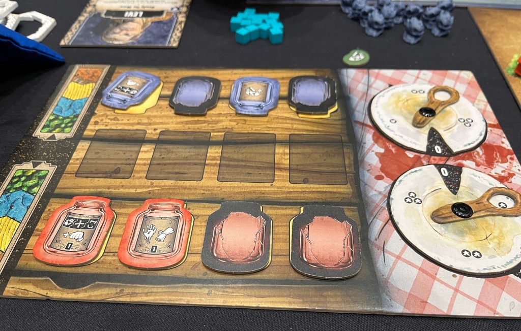 I played Emmy for the Chapter 1 game at SHUX. The Protectors play a sort of track improvement game, collecting action tokens from the board to improve each action row. Whereas, the Family plays a bag-building game, adding these tokens from the board to a bag and drawing them on their turn. All characters have different legend abilities, such as Emmy’s shelter action.