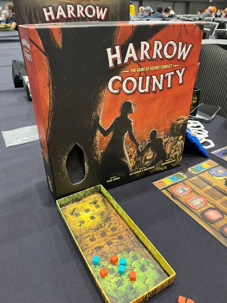 Launching on Kickstarter just after SHUX concluded, Harrow County: The Game of Gothic Conflict is a board game designed by Jay Cormier and Shad Miller. Harrow County is based on the comics of the same name and published by Off the Page Games, a publisher dedicated to comic-book based games, who previously released Mind MGMT.