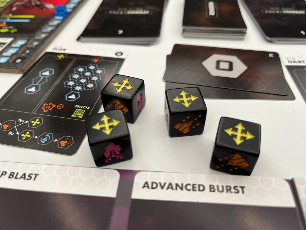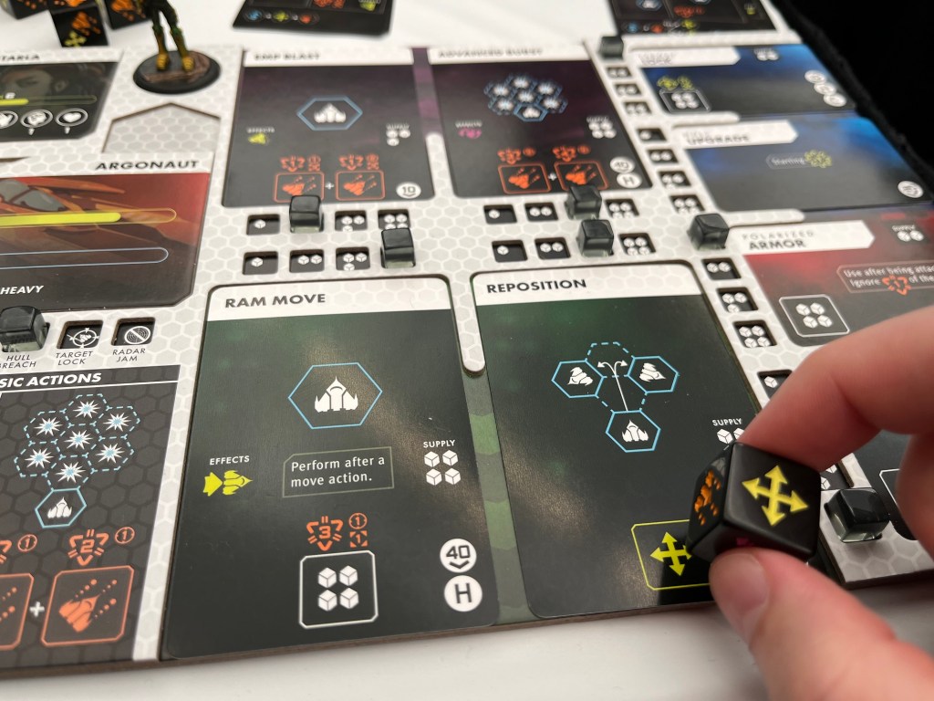 Players roll dice and allocate them on their ship boards to perform moves and attacks. Some actions will cost resources (little white cubes) in addition to placing a die.