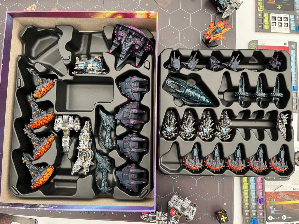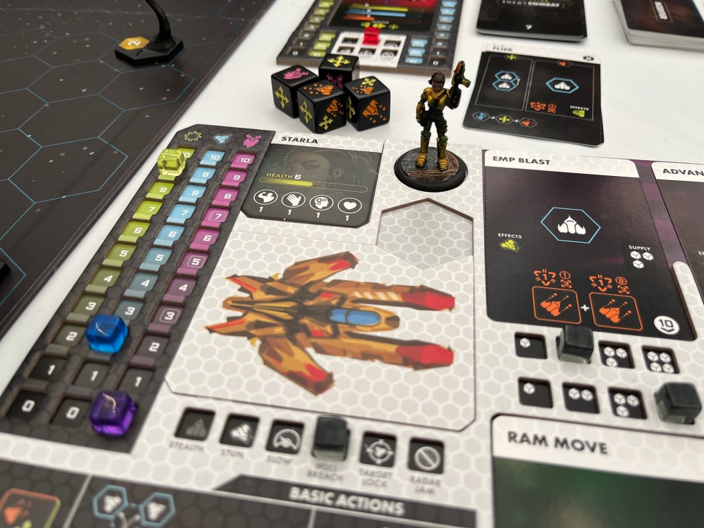 Player boards are dual layered with slots to mix and match cadets and ships, as well as upgrade actions and equipment.