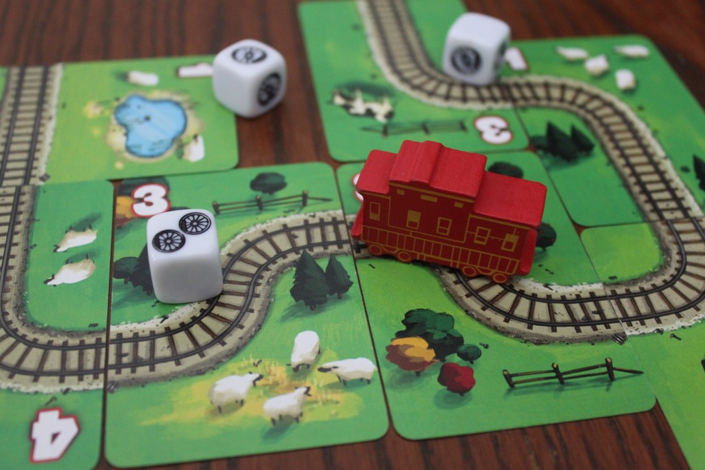 A train caboose is on the loose! Extend the track by playing cards to avoid it going off the rails. Roll the matching number of dice to advance the caboose. Penalties will be scored for letting the train derail.