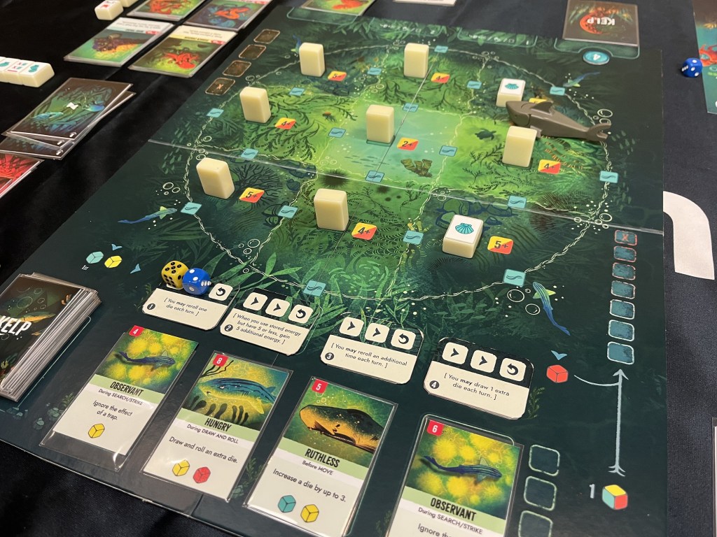 One of the hottest games at Gen Con wasn’t in the main exhibit hall. Wonderbow Games was demoing Kelp in the First Exposure Playtest Hall and both seats were taken immediately. If you weren’t the first playtesters of the day, you had to hunt them down around the convention center to get a demo. Everything shown in this preview are prototype components that may change during final production.