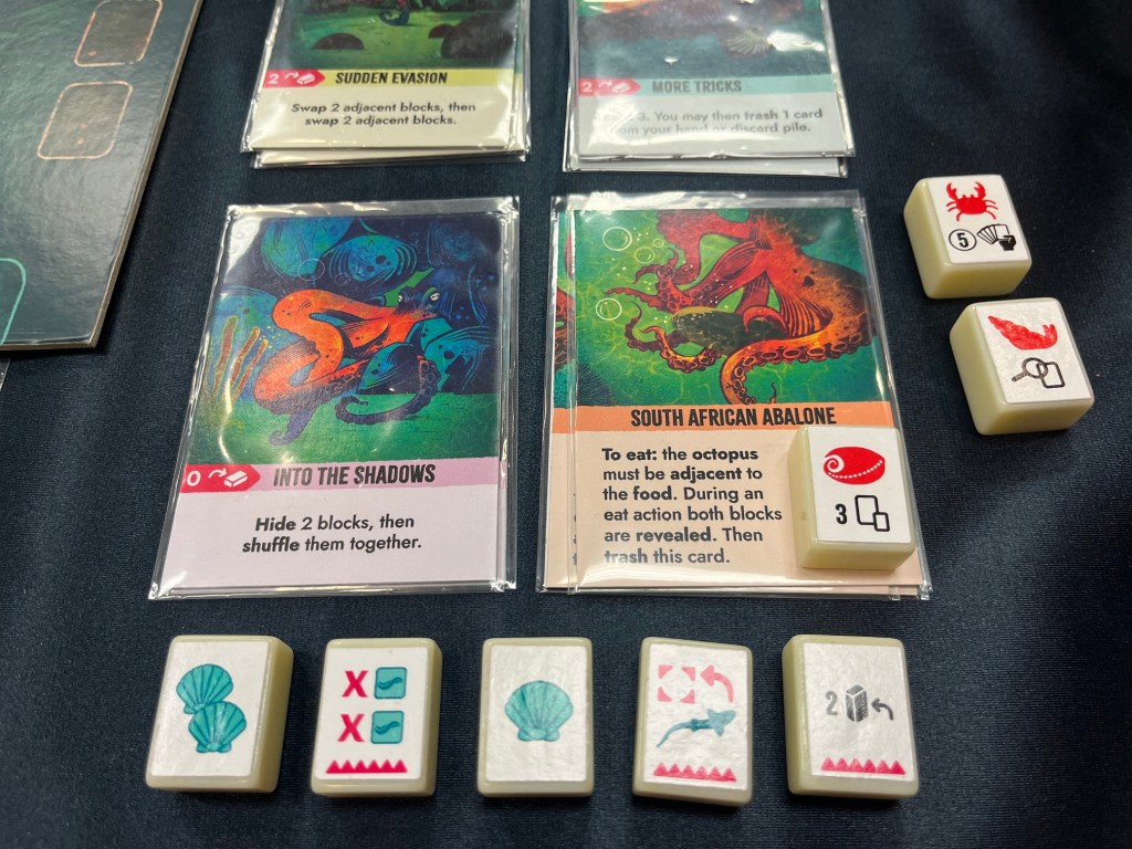 The more challenging win condition for the octopus is to acquire and eat 4 different food tiles. I made the mistake of attempting this strategy in my first play and it did not go well. Hopefully when Kelp is released I can do better next time.