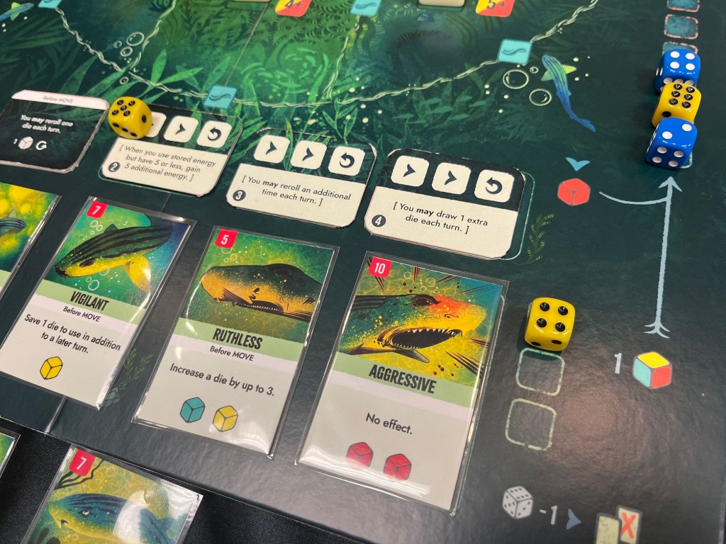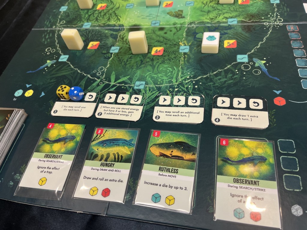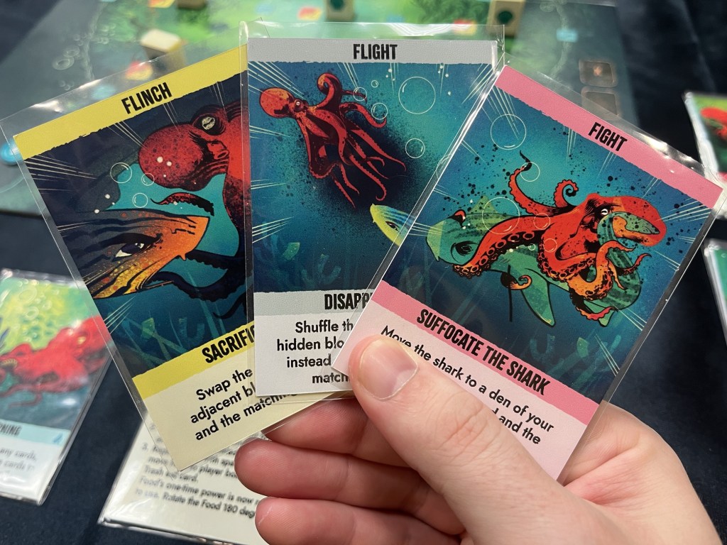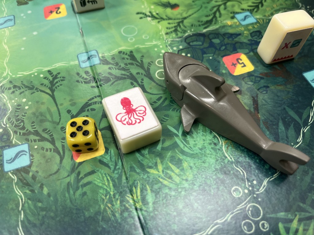 The shark plays a bag-building dice game, attempting to find the octopus’s hiding spot and attack. Dice can be spent to purchase more dice and grant special effects.