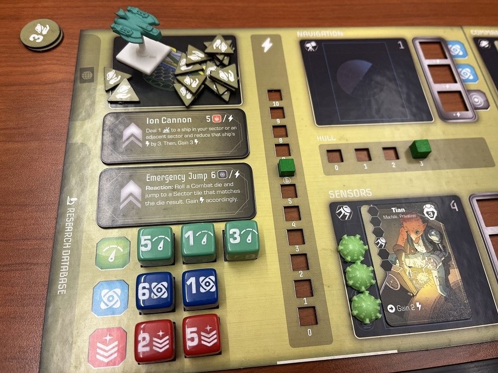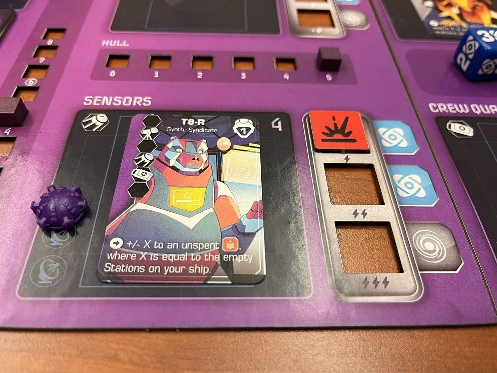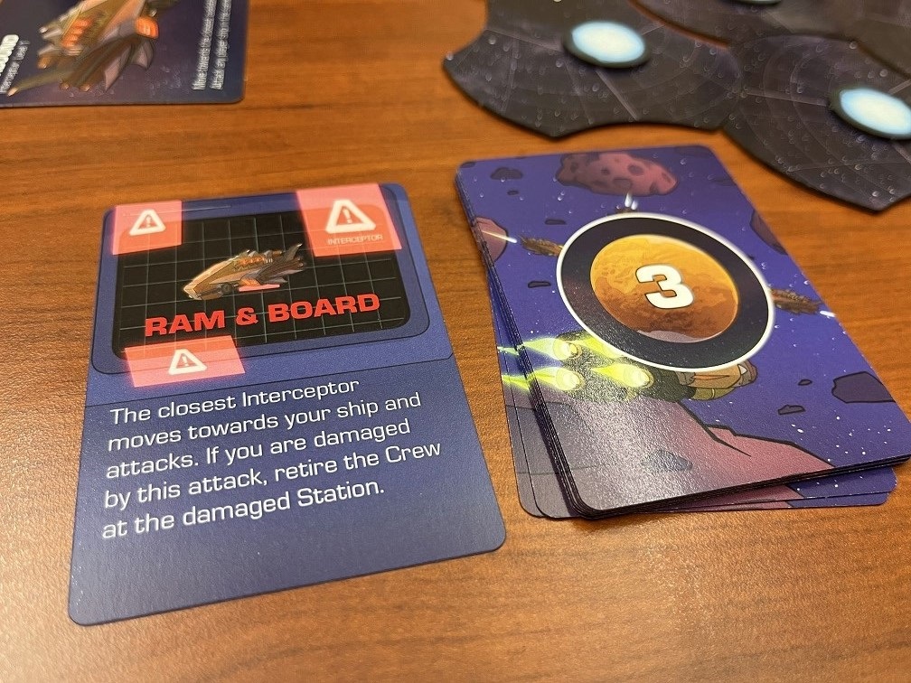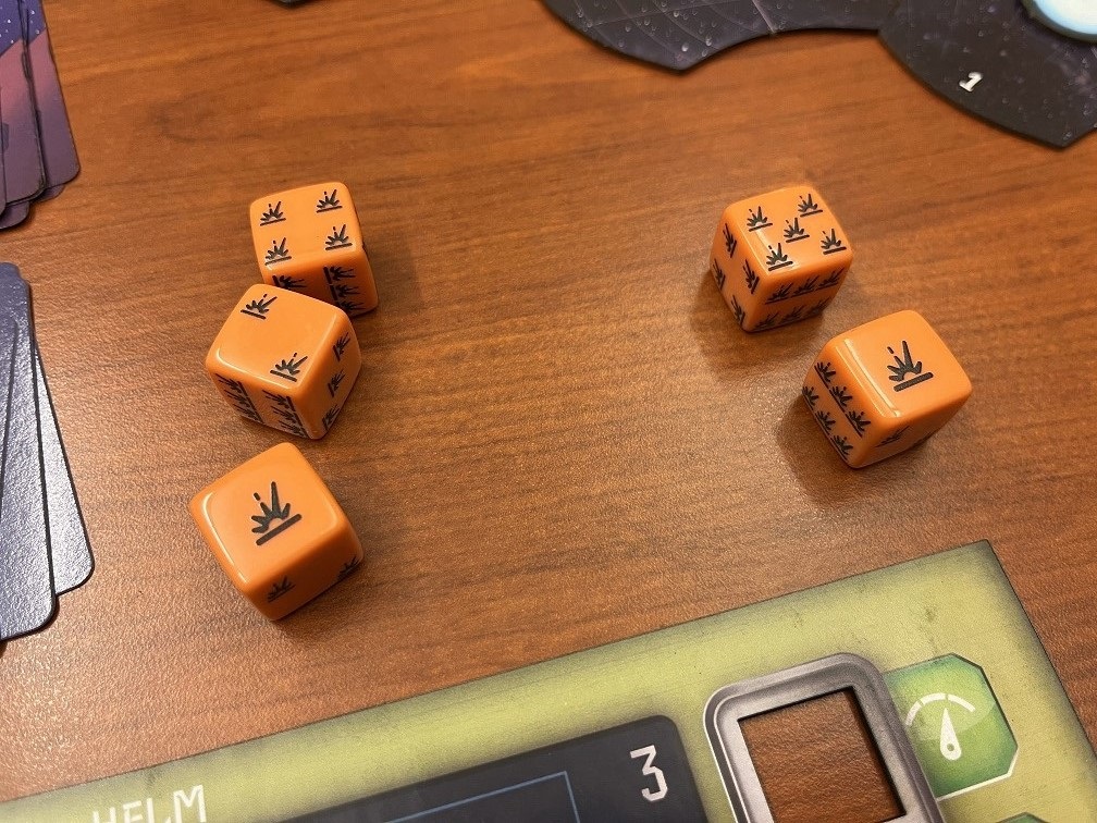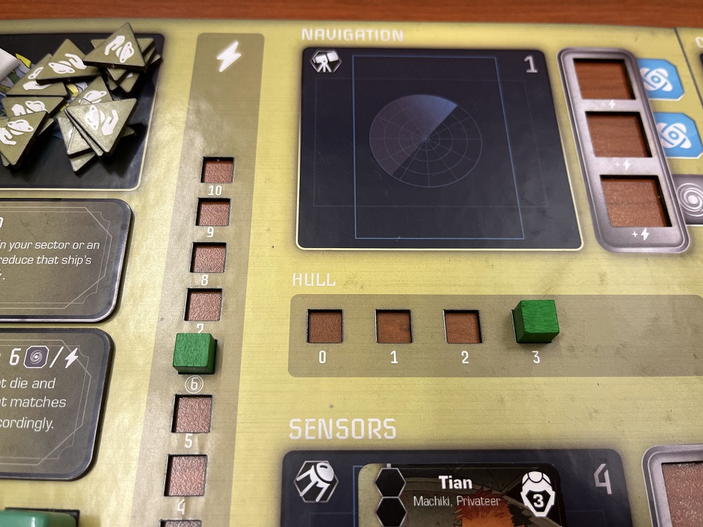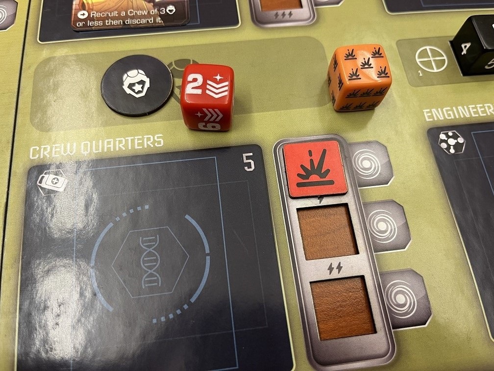 Unmatched dice hit on the station matching their value. If the roll above had the attacker on the left, only 1 was blocked and hits will be taken in stations 2 and 4. A damage token is placed over the top die slot, limiting your ability to take actions there. If a station is fully damaged, the hull damage tracker will be reduced which is non-repairable and loses points during end game.