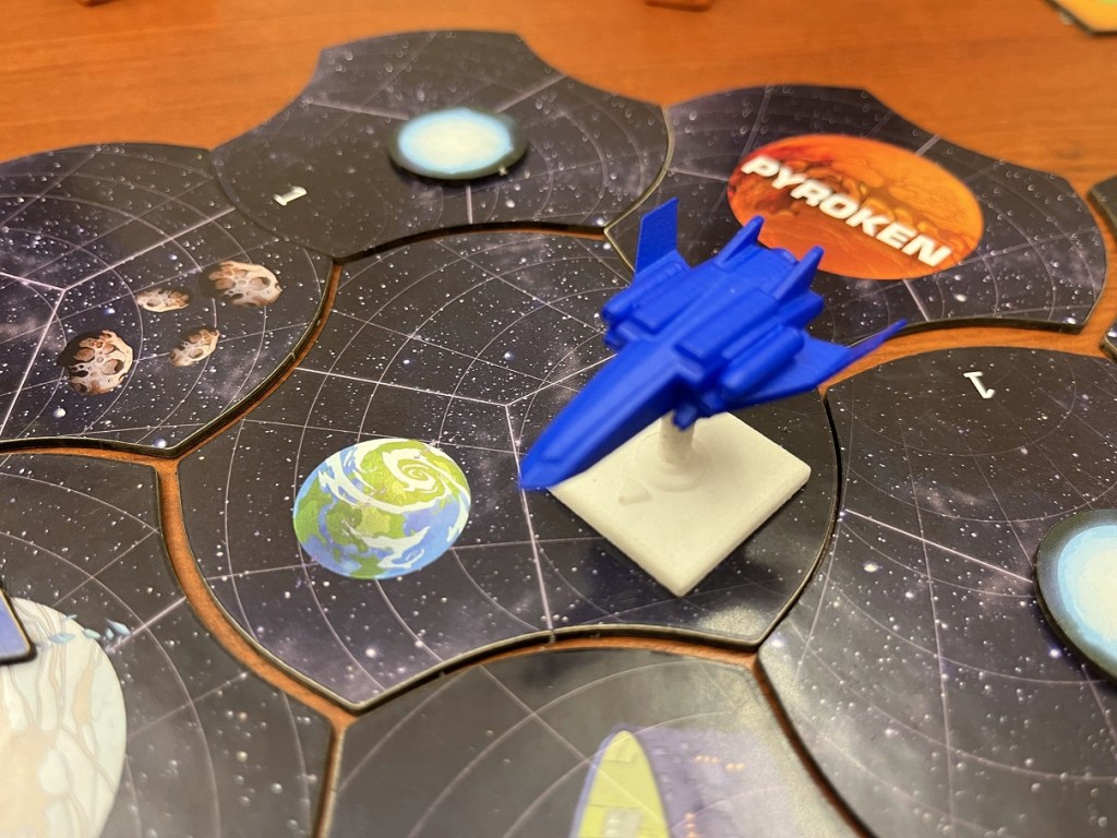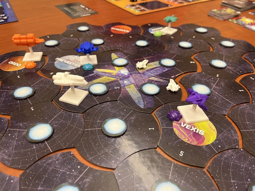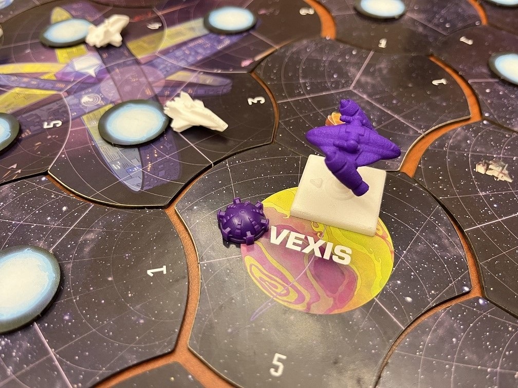 Each sector of space has a token for the first player to explore there, which may reward you with experience or have you run into an enemy ship. Sometimes anomalies will be encountered while exploring.