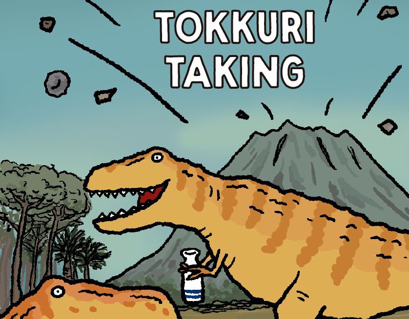 Dinosaurs are having a party and they love drinking sake in the Japanese card game Tokkuri Taking. Players supply more sake in tokkuri, which are traditional drinking vessels from Asia, or play cards to drink from tokkuri hoping to empty them out completely. Empty bottles score points and leftover bottles lose points. Each round the winner take chips from losing players until one player is out of chips and then the overall winner is declared.