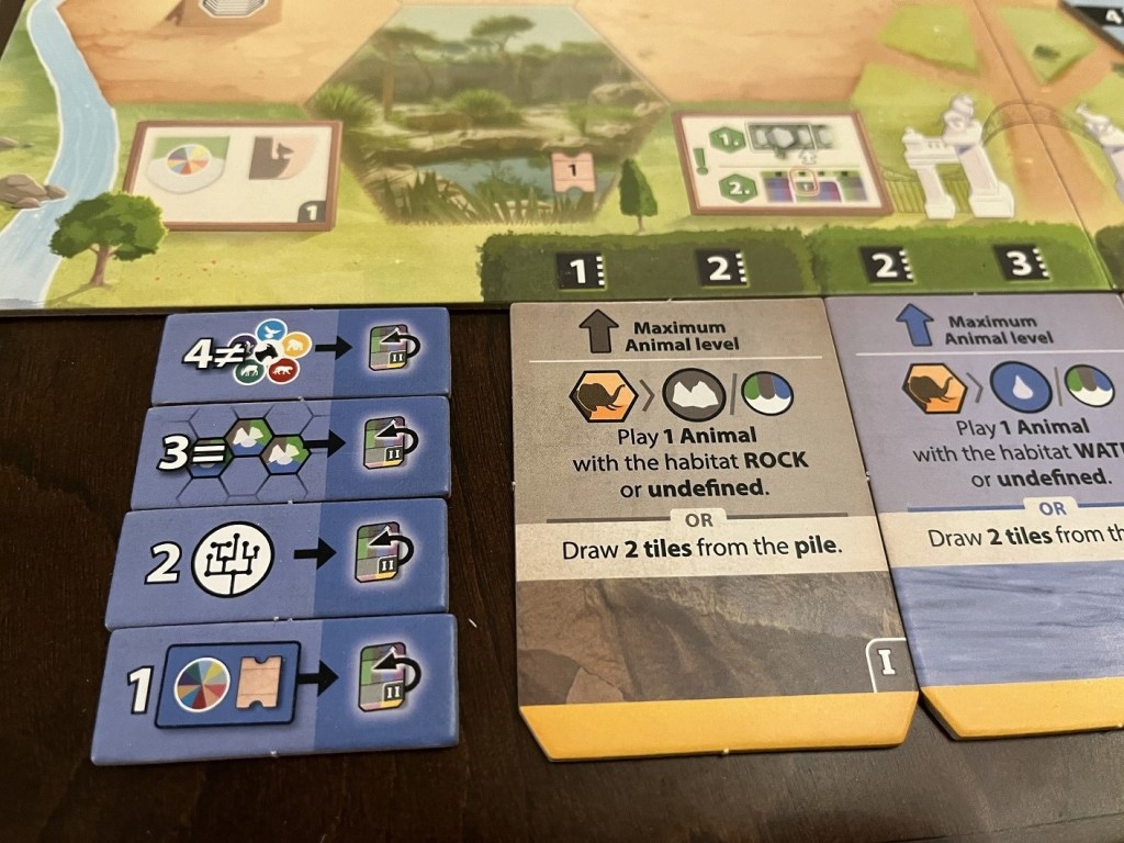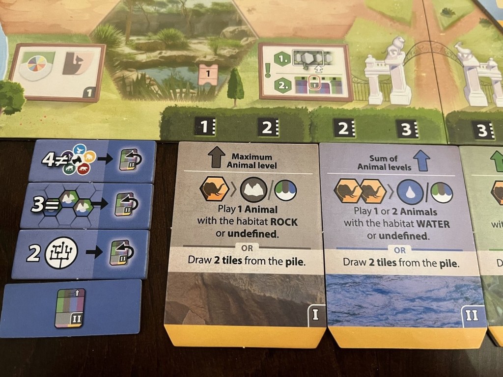 Buildings are very important in Sanctuary, as regardless of which action players choose, they can always play a building tile on their turn. In addition to their special effects, they give you habitat and animal class icons necessary for conservation objectives and upgrade requirements.