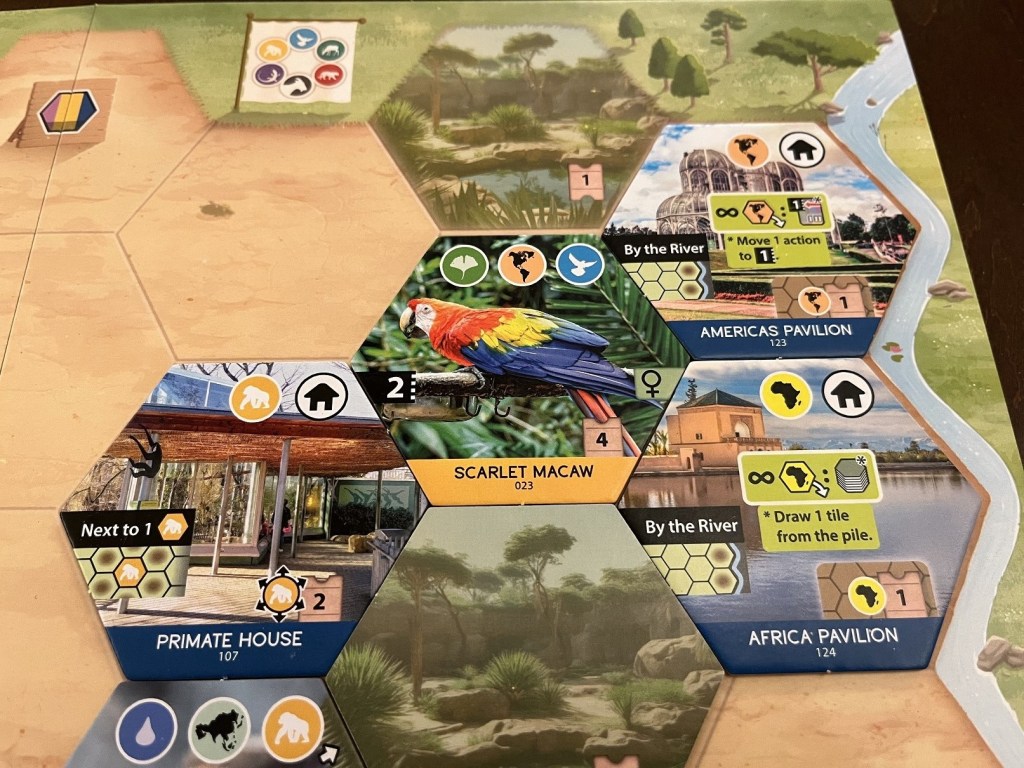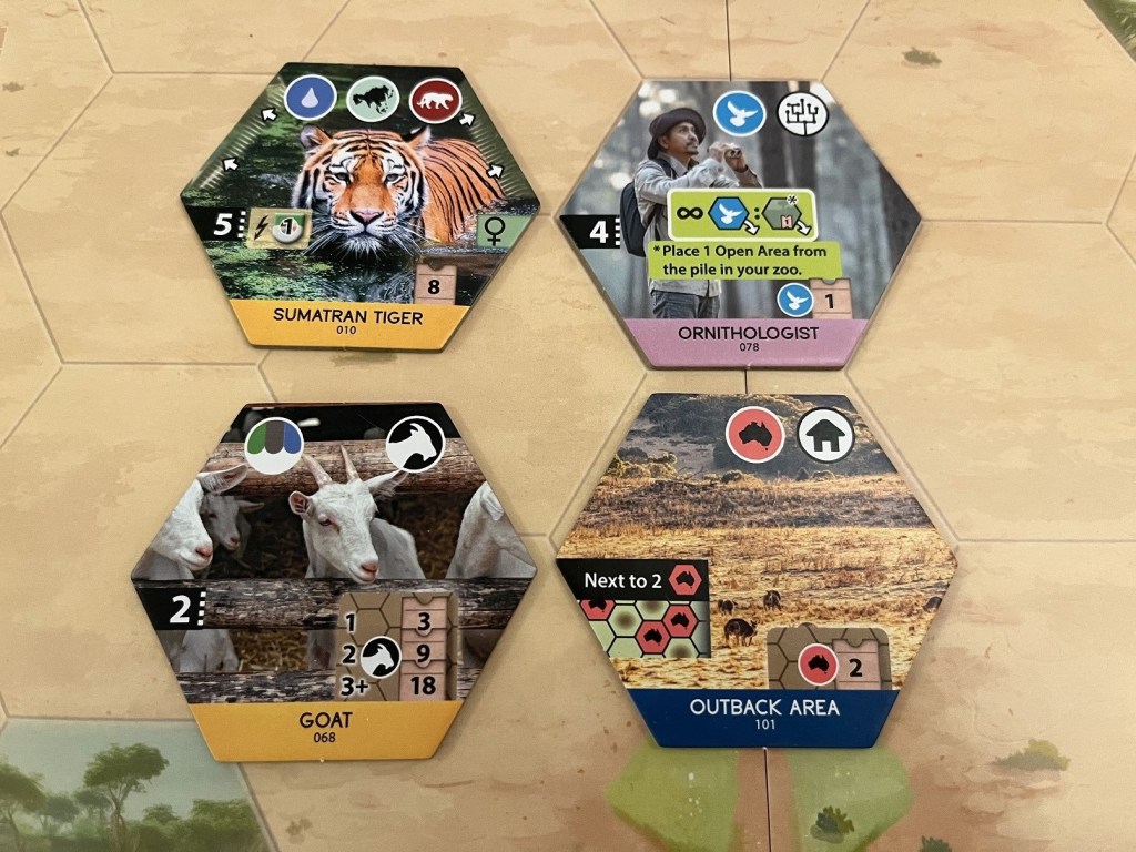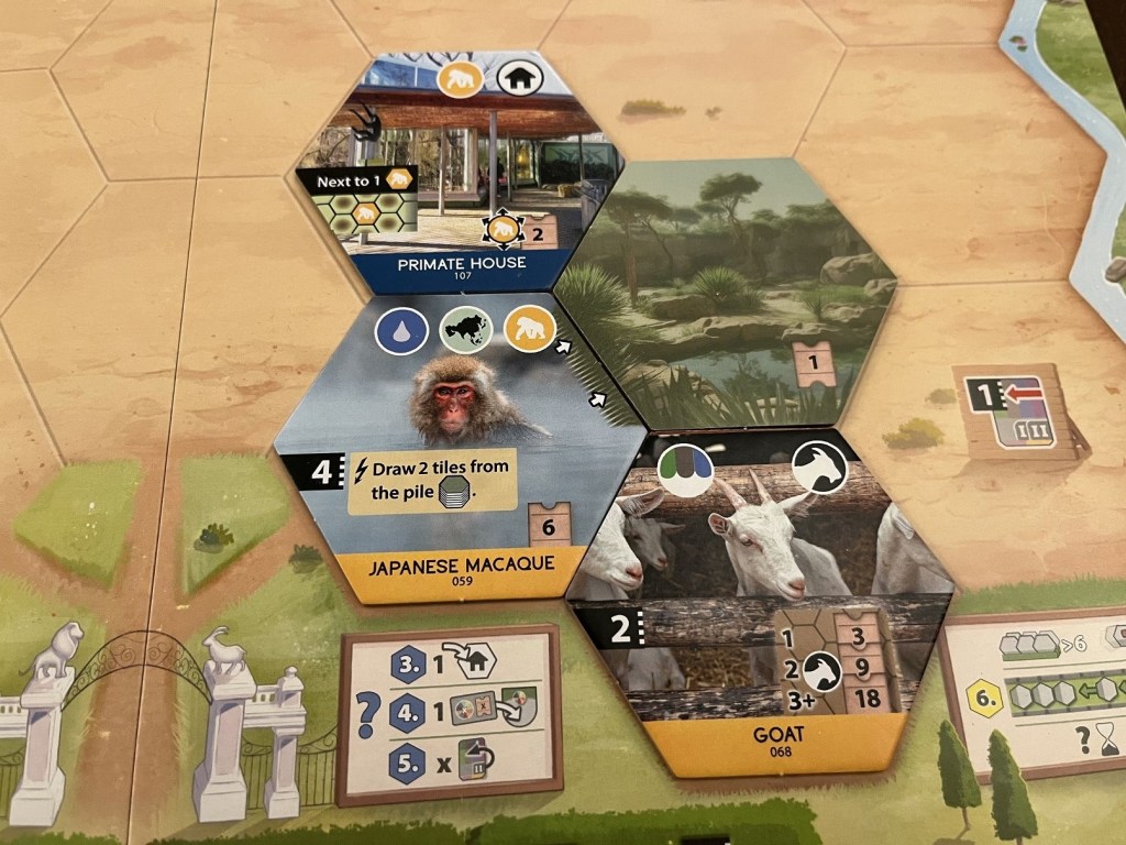 There are animal, project, and building tiles. Some tiles score fixed points, others will have variable scoring. The Ornithologist project tile will score 1 point for every bird anywhere in the zoo. Tiles with a hex pattern behind the scoring criteria want the specified icons in a connected network. The Outback Area building tile scores 2 points for every Australia icon connected to the tile, including tiles connected through other tiles with the same icon. Whereas, the Primate House (below) only scores for primate icons on tiles directly connected to it.