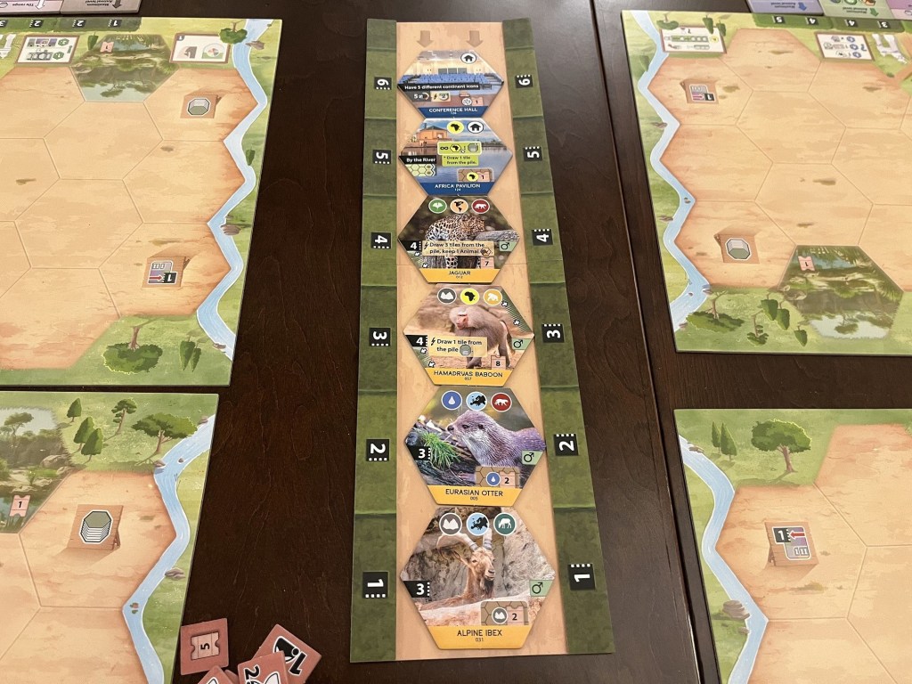 The game continues until any player has filled their zoo, supported 4 conservation objectives, or the tile supply is empty. All players then take one more turn before final scoring.